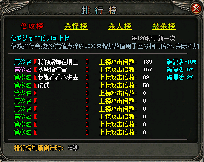 活动介绍三:神魔降临-每三小时触发,地图内刷新若干各种倍率BOSS和魔神使者,掉落所有礼盒和高级装备,散人逆袭的最佳地图